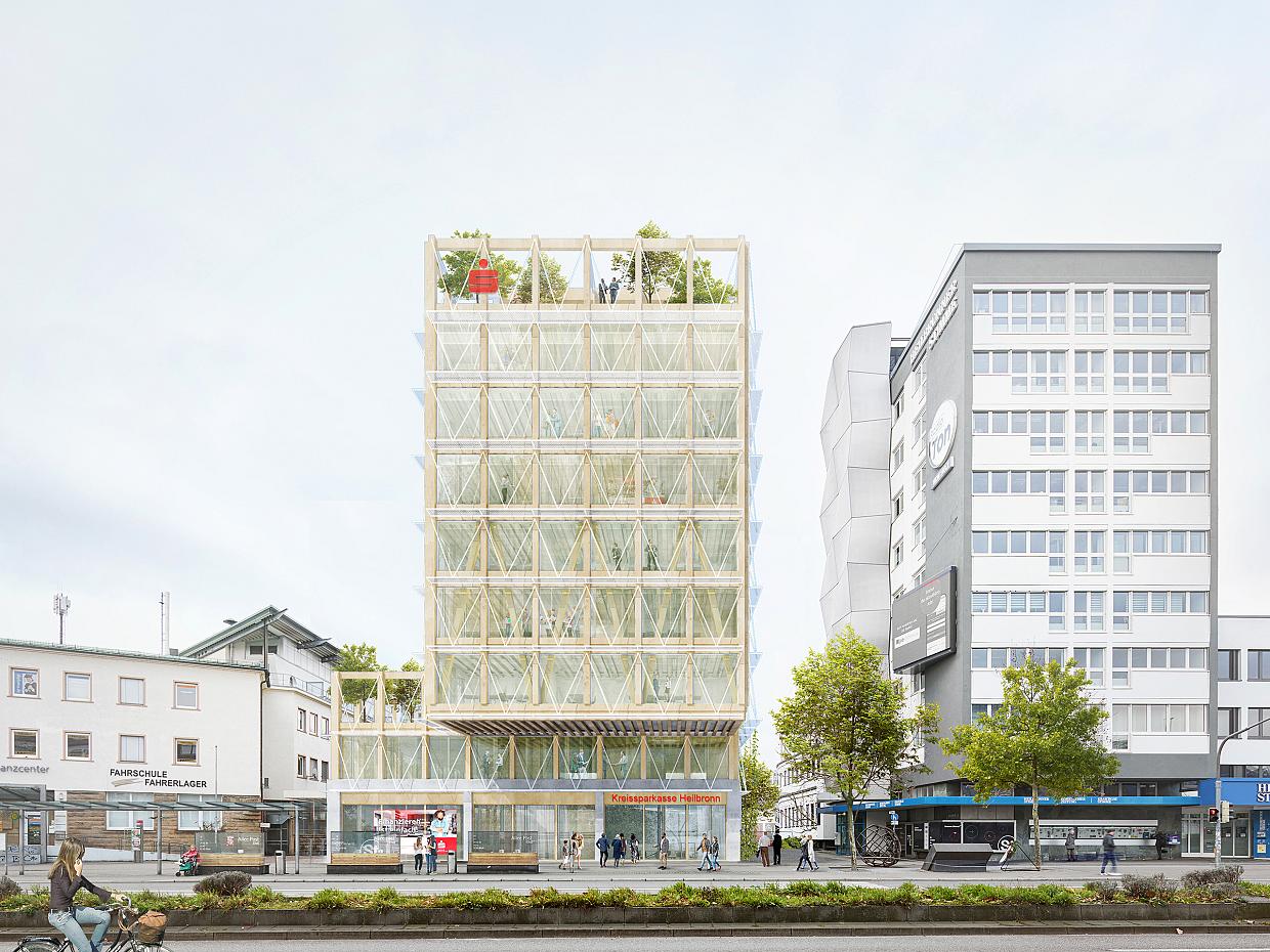 Mit dem Sparkassenquartier soll ein urbanes Ensemble entstehen, das qualitativ hochwertige Arbeitswelten für die Mitarbeitenden sowie attraktive innerstädtische Räume mit hoher Aufenthaltsqualität für die Stadt bietet, und an prominenter Stelle die gesellschaftliche und ökologische Verantwortung der Kreissparkasse Heilbronn zum Ausdruck bringt. Neben dem Erhalt eines Bestandbaus unterstreicht eine ressourcenschonende und CO2-neutrale Bauweise in Holz mit kompakten Gebäudevolumen dieses Vorhaben und garantiert eine hohe Gesamtwirtschaftlichkeit – sowohl im Bau als auch im Betrieb.